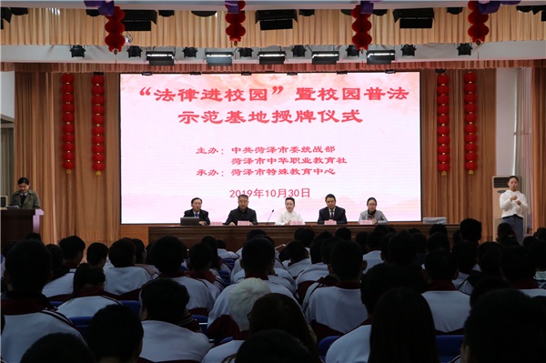 為增強同學們的法制觀念和自我保護意識, 10月30日上午,中共菏澤市委統(tǒng)戰(zhàn)部、菏澤市中華職教社走進菏澤市特殊教育中心聯合開展“法律進校園”活動,并舉行了校園普法示范基地授牌儀式。